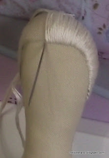 Quando a cabeça estiver toda coberta com a lã, usando a mesma linha de bordar só que agora dois fios, prendemos com pequenos pontos a lã na cabeça. Prendemos onde estão os alfinetes, no contorno do bordado, na parte de trás da nuca, etc.