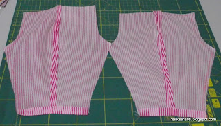 4- Costurar bem em cima da linha riscada deixando a parte de baixo do corpo sem costurar. O comprimento do ponto na máquina de costura é pequeno ( 1,9 ou 2 ) que facilita a costura das curvas (arredondadas e sem bicos). Depois passe bem a ferro e recorte deixando uma margem de 0,75 a 1 cm. Faça pequenos piques principalmente nas curvas para assentar melhor o tecido.