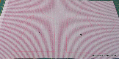 Para a frente, colocamos o molde no tecido, marcamos e depois viramos o molde e marcamos outra vez. Um para a direita e outro para esquerda, imagem espelhada, ver a segunda foto.