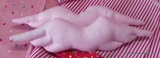 Nossa Tilda tem braços muito finos e pernas bem torneadas. Coloquem as peças já costuradas e observem panturrilhas, coxas, antebraços, tudo bem delineado, curvas e mais curvas. O plumante precisa ser colocado nas extremidades finas dos braços e pernas. Faça uma pequena bolinha e vá até a ponta, isto ajuda a não ficar vazia pois a tendência da fibra é subir. O ideal é colocarmos o plumante de tal forma que a pele não fique parecendo " a temida casca de laranja", rsrsrs, até Tilda, então todo o cuidado, vá com calma.