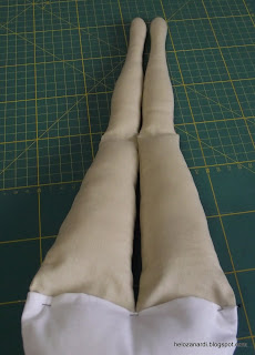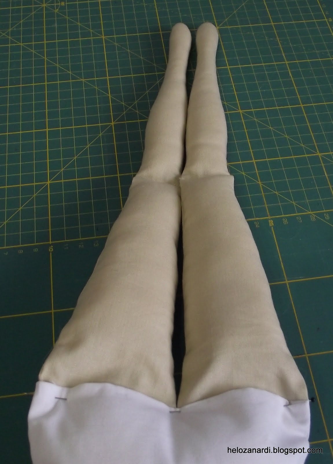 6- No tecido escolhido para a pele dobramos mais um retângulo para pernas e braços. Copiamos os moldes. Costuramos na linha, passamos a ferro, cortamos, e viramos para o direito.