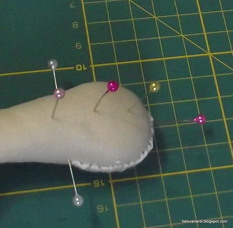 Aqui coloquei dois pequenos alfinetes para marcar os olhos. O bom de usar o alfinete é que não gostando da posição podemos mudar e gostando é só fazer o ponto bem onde está o furo do alfinete. Mas vamos terminar esta parte no próximo e último passo, na semana que vem.