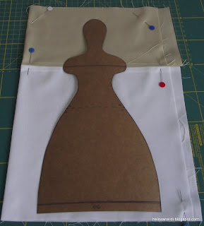 3- Dobre o retângulo, fazendo coincidir costura com costura, pelo avesso, ver a primeira foto abaixo. E coloque o molde em cima do tecido. A costura que fizemos antes fica na altura da linha forte do molde. Risque o tecido com uma linha fina. Eu uso lápis 6B bem apontado, assim tenho uma linha forte e bem fina.