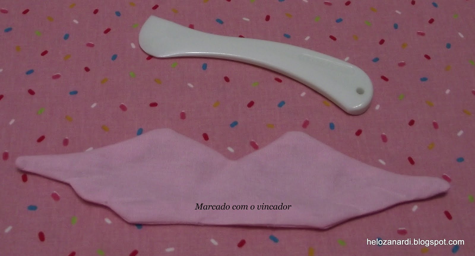 Costuramos a asa e viramos para o direito. Fazemos com o vincador a marcação para as pequenas costuras conforme o molde e costuramos na marcação.