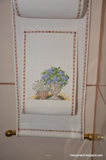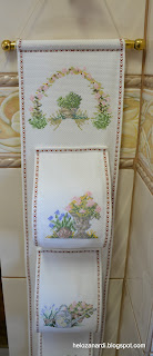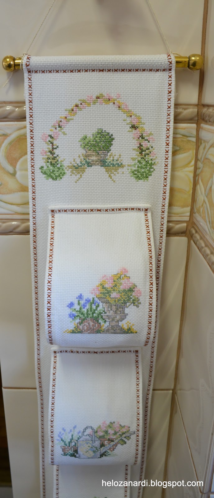 Porta- rolos de papel higiênico, um dos primeiros trabalhos que eu fiz em ponto cruz, estava guardado e sem uso, foi limpar os varões, refazer as costuras para ficarem maiores os lugares dos rolos e pendurá-lo. Gosto desse jardim.