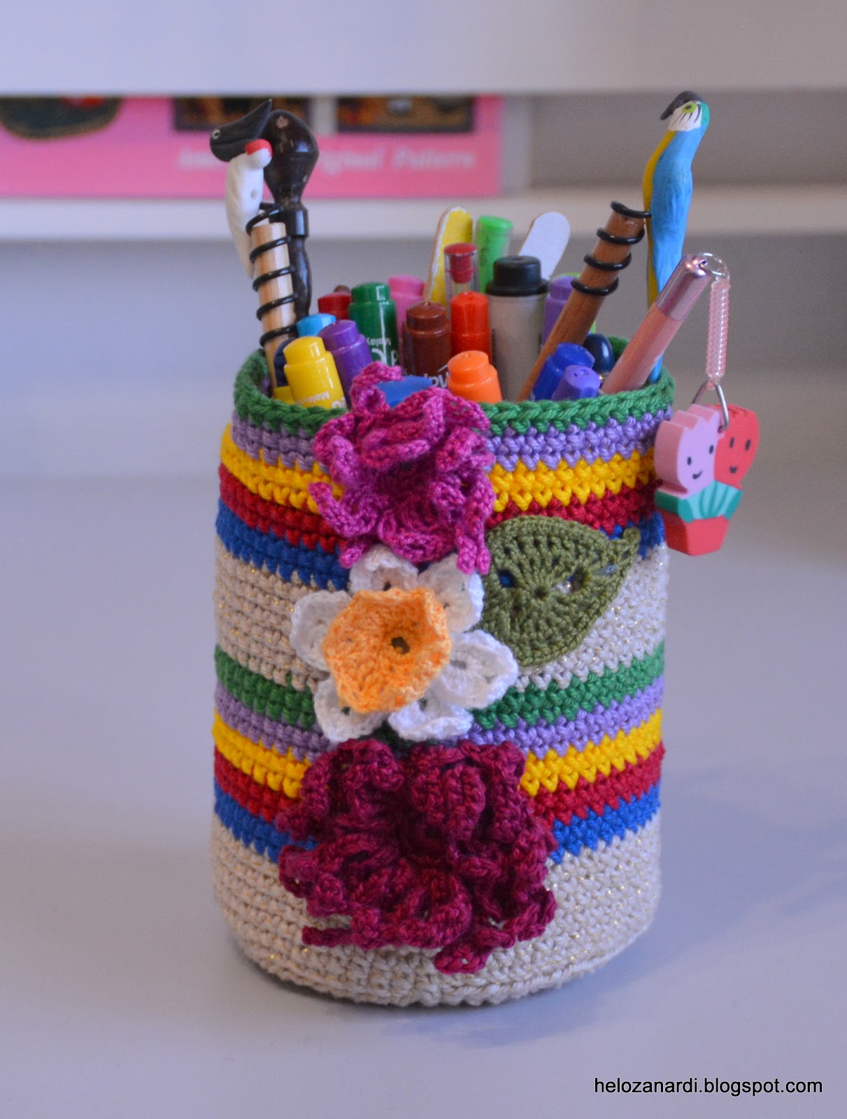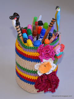 E um porta-lápis "Frida Kahlo", porque cor é tudo de bom, vestindo pote de plástico que reaproveitado não foi para o lixo.