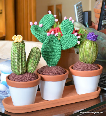 Três vasinhos comprados na antiga loja Mesbla, que nem existe mais, ganharam cactos de crochê.