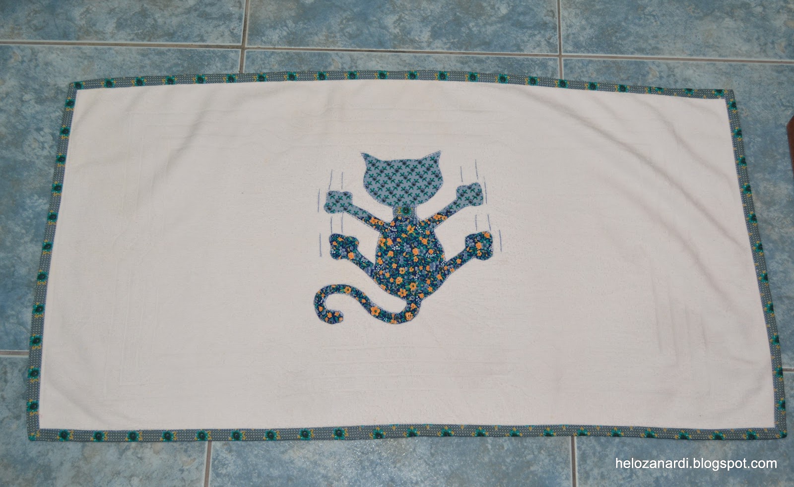 Um piso de banheiro que já estava descosturado e manchado ganhou barra e aplicação de gatinho segurando tudo que pode por medo de água.